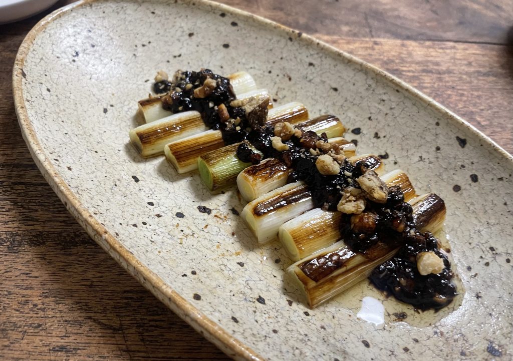 ねぎは6cmくらいの長さに切って焼くだけ。とろっとさせたいので、焼き色がついた時点で少し水を入れて蓋をしてすぐ開ける。ソースのほうを先に作る。くるみは砕いて炒っておく。ごま油を熱して、刻んだにんにく、自家製納豆味噌、冷蔵庫で寝ていた甜麺醤、どぶろく酢。加熱しながらよく混ぜ、乳化っぽくなったらくるみを入れておしまい。この自家製納豆味噌を愛している。そろそろ2年ものになるが、ずっとおいしくなりつづけていてすごい。これのおかげで、八丁味噌と酢と油の組み合わせにずっとハマっている。